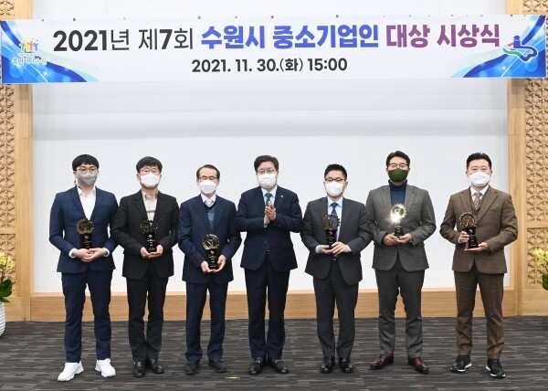 ‘수원시 중소기업인 대상’은 기술개발·경영혁신 등으로 지역경제에 활력을 불어넣고 일자리 창출에 앞장서 수원시 위상을 높인 우수 중소기업인에게 수여하는 상이다.