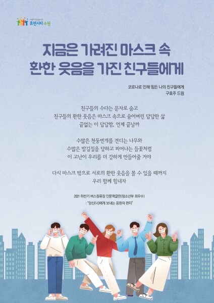 수원시는 지난 9월 ‘당신에게 보내는 응원의 편지’를 주제로 한 시민 창작글 공모전을 진행했고 인문학글판 심사위원회 심의와 인권영향평가 등을 거쳐 78편을 수상작으로 선정했다.