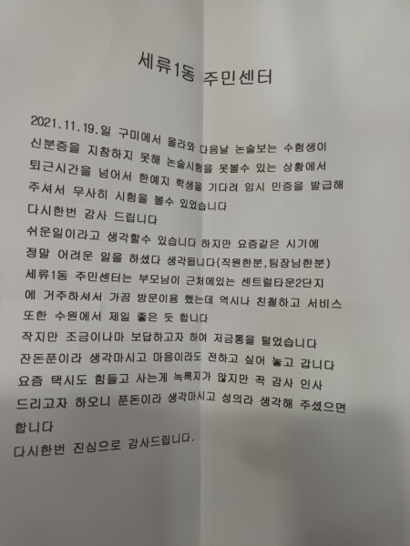 김태형 주무관은 “재발급이 꼭 필요한 상황이라고 판단해 흔쾌히 ‘기다리겠다’고 했다”며 “한예지양이 무사히 시험을 치러서 다행”이라고 말했다.