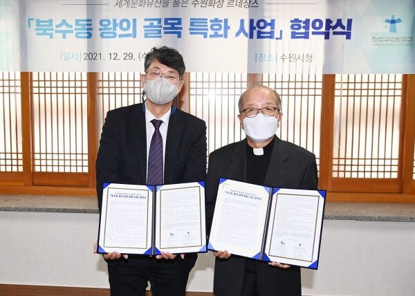 수원시와 수원교구는 29일 수원시청에서 ‘행궁동 도시재생사업 북수동 왕이 골목 특화사업 업무협약’을 체결하고 사업의 성공적인 추진을 위해 협력하기로 약속했다.