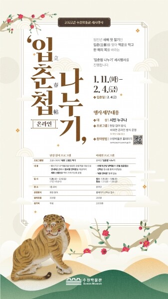 1월 11일부터 18일까지 비대면으로 진행되는 ‘온라인 입춘첩 나누기’는 수원박물관 홈페이지에서 참가 신청을 해야 한다.