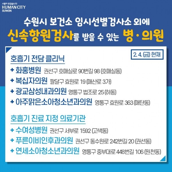 현재 수원시 4개 구 보건소 임시선별검사소 외에 신속항원검사를 받을 수 있는 병·의원은 호흡기 전담 클리닉인 화홍병원·복십자의원·광교삼성내과의원·아주맑은소아청소년과의원과 호흡기 진료지정 의료기관인 수여성병원·푸른이비인후과의원·연세소아청소년과의원 등 7곳이다.
