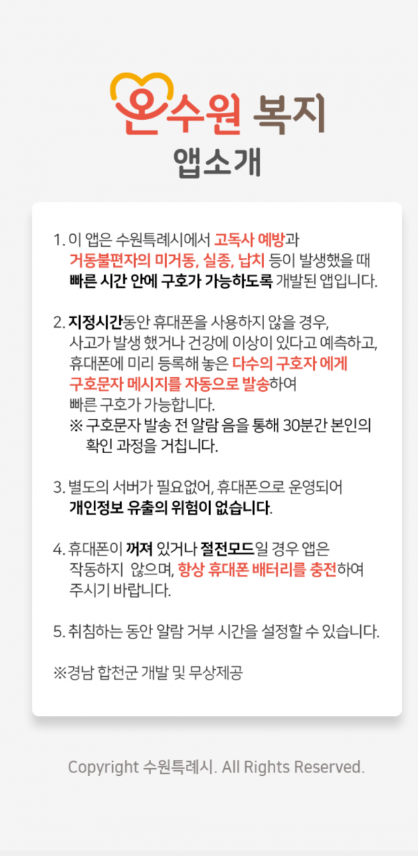 3월 2일부터 운영하는 ‘ON수원 안심서비스’는 안전확인이 필요한 취약계층 시민이 24시간 동안 스마트폰을 사용하지 않으면, 앱에 등록해 놓은 보호자와 동행정복지센터 직원 등에게 위기상황 알림문자가 전송되는 것이다.