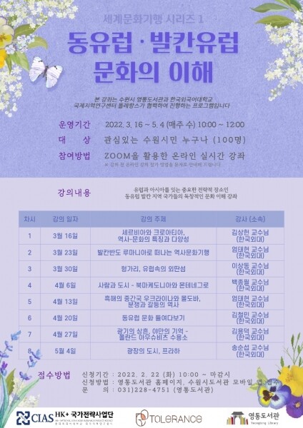 영통도서관과 똘레랑스는 협약 후 첫 협업 프로그램으로 3월 16일부터 5월 4일까지 매주 수요일 ‘2022년 영통도서관 세계문화기행 시리즈 1-동유럽·발칸유럽 문화의 이해’를 함께 진행한다.