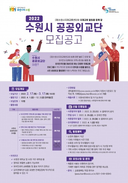 활동을 원하는 대학생은 수원시국제교류센터 홈페이지 ‘새소식/공지사항’ 게시판에서 ‘2022년 수원시 공공외교단 모집공고’에 첨부된 지원서를 내려받아 작성한 후 3월 17일 오후 4시까지 담당자 전자우편로 제출하면 된다.