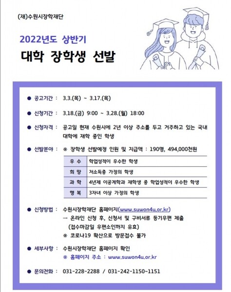 공고일 현재 2년 이상 수원시에 주민등록을 두고 있으면서 국내 대학에 재학 중인 학생이 장학금을 신청할 수 있다.