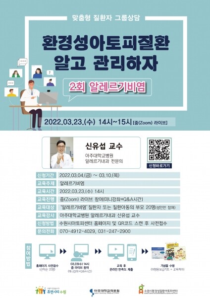 3월 23일 오후 2시부터 한 시간 동안 온라인으로 진행되는 맞춤형 질환자 그룹 상담은 아주대학교병원 알레르기내과 전문의 신유섭 교수가 알레르기비염 원인과 증상, 진단·관리 방법, 올바른 치료법 등을 설명한 후 참가자의 질문을 받는 방식으로 진행된다.