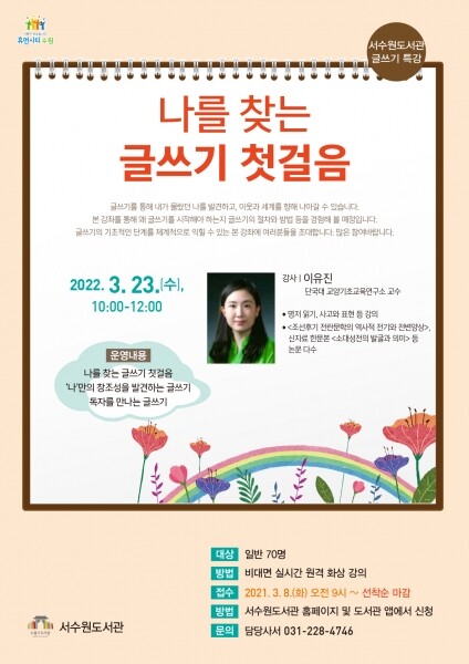 서수원도서관 홈페이지 ‘통합예약/신청→독서문화프로그램’에서 ‘글쓰기 특강 ‘나를 찾는 글쓰기 첫걸음’’을 선택해 신청하면 된다.