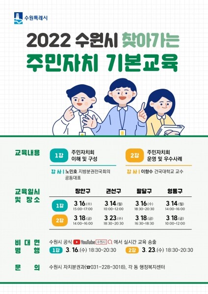 16·23일에 진행하는 교육은 비대면 방식으로 병행 운영되며 수원시 공식 유튜브 채널에서 생중계한다.