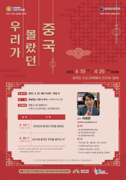 3월 22일 오전 10시부터 수원시 도서관 통합예약시스템에서 ‘독서문화프로그램’→‘우리가 몰랐던 중국’을 선택해 수강 신청할 수 있다.