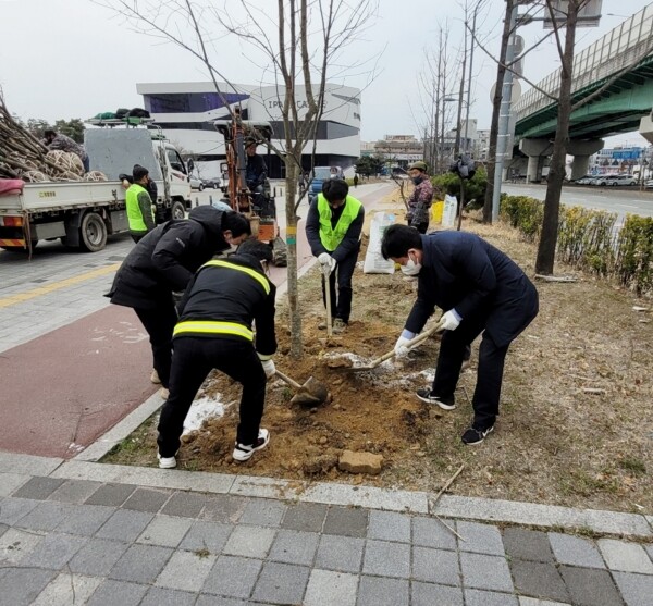 수원시공원녹지사업소 공직자와 수원도시숲연합회 회원 등 20여명은 23일 수원버스터미널 사거리 인근 녹지대에 팥배나무 25그루를 심었다.