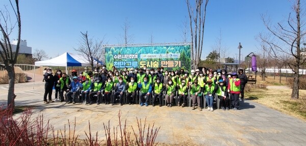 수원시공원녹지사업소 공직자와 수원심꾸기봉사단·수원기후행동네트워크 회원 등 80여명은 마중공원 일원에 버드나무 8그루와 노랑말채·병꽃나무·황매화 등 관목 등을 심었다.