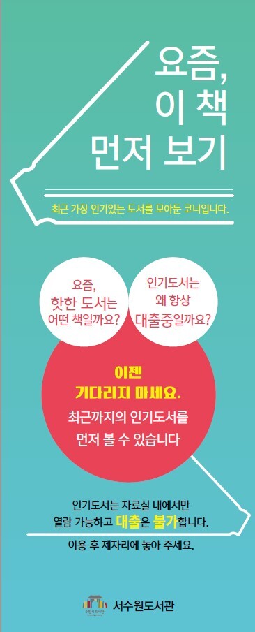 서수원도서관 관계자는 “도서관 책들은 대출 기간이 정해져 있어 도서 회전율이 낮고 인기도서의 경우 예약이 많아 대출을 하려면 한참을 기다려야 하는 경우가 많다”며 “인기 도서를 빨리 읽고 싶은 시민들은 ‘요즘, 이 책 먼저 보기’ 코너를 찾아 달라”고 말했다.