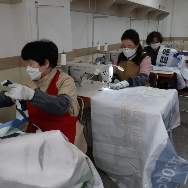 이후 수원시는 수원도시공사에 폐현수막 440매를 지원했고 수원도시공사는 수원시여성단체협의회 회원·자원봉사자 등 시민 70여명과 함께 수원시가족여성회관 의상실에서 폐현수막을 활용해 재봉틀로 자루를 만들었다.