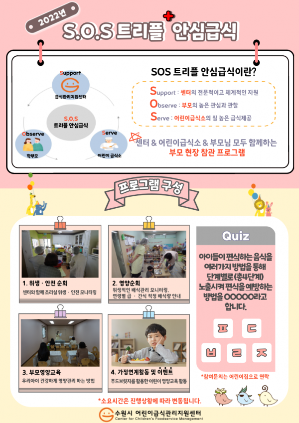 S.O.S는 수원시어린이급식관리지원센터의 전문적이고 체계적인 지원, 학부모의 많은 관심과 관찰, 어린이급식소의 질 높은 급식 제공 등 3가지 요소를 골고루 갖추자는 의미다.