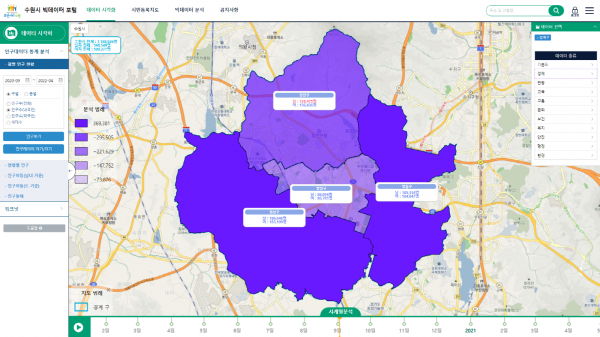 수원시는 ‘빅데이터 포털’을 운영하며 수원시의 다양한 공공데이터를 분석하고 시각화한 정보를 시민들에게 제공하는 등 데이터 기반 행정을 활성화하고 있다.