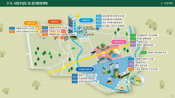 ‘탄소중립 그린도시 스마트센터’, ‘BEMS, 그린리모델링’, ‘옥상, 주차장 태양광 발전’, ‘전기차 전용 BIPV 충전타워’ 등을 설치할 예정이다.