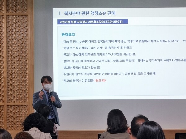오도환 변호사는 복지 분야 행정처분·소송 사례·민간위탁 관련 사항 등을 설명하고 “송무에 대해 잘 알고 있으면 행정 소송 발생을 줄이고 소송에 효과적으로 대응할 수 있어 행정력 낭비를 줄일 수 있다”고 말했다.
