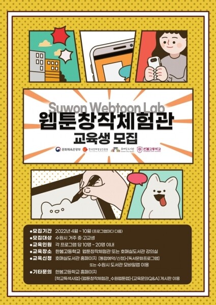 ‘웹툰창작체험관-수원웹툰랩’은 호매실도서관의 인문학 콘텐츠와 지역 인프라를 기반으로 한봄고등학교가 협력해 웹툰 창작교육과 직업체험, 진로 탐색 프로그램 등을 제공하는 것이다.