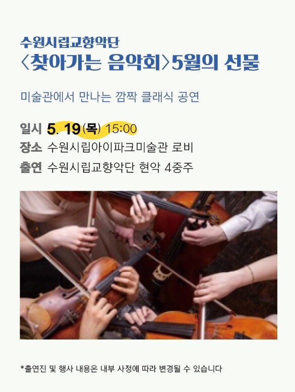 이번 공연은 수원시립교향악단의 제1바이올린 나은혜, 제2바이올린 채소진, 비올라 이길래, 첼로 조옥근 등 현악 4중주가 모차르트의 세레나데 사장조 작품 525번 “아이네 클라이네 나하트 뮤지크”를 연주한다.