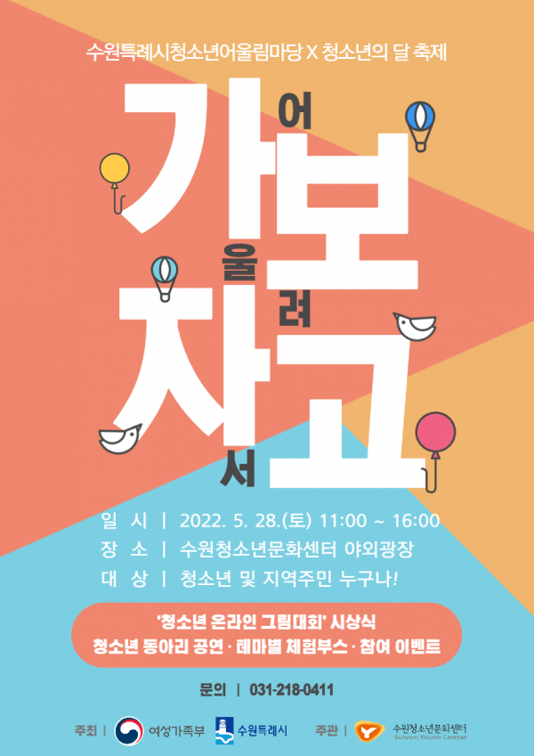 수원청소년문화센터 소속 청소년 자치기구 및 동아리와 유관기관이 참여해 환경, 과학, 마술 등 13개 테마별 체험부스를 운영하고 댄스 및 치어리딩 등 7개 청소년동아리의 문화·예술 공연과 어울림마당 ‘청소년 온라인 그림대회’ 시상식이 진행될 예정이다.