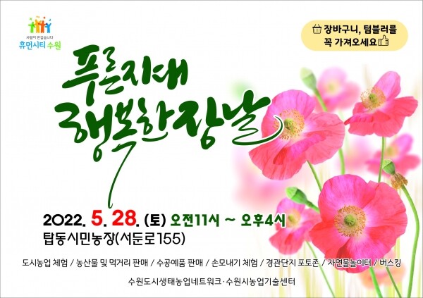 수원시 관계자는 “28일에 탑동 시민농장으로 오면 건강한 먹거리와 도시농업을 체험하며 소중한 추억을 남길 수 있을 것”이라며 “행사장을 찾는 시민들이 장바구니·텀블러 등을 사용하도록 유도해 일회용 쓰레기가 없는 친환경 장날 행사를 운영하겠다”고 말했다.