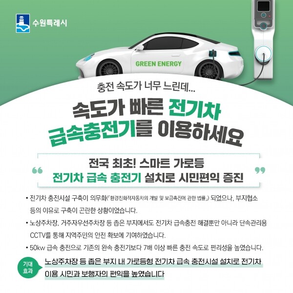 수원시는 지난해 3월 민간충전사업자와 업무협약을 체결하고 수원도시공사 등과 협의해 장다리공영노상주차장과 매탄4지구노상주차장에 가로등형 50kW 용량 전기차 급속충전기를 1기씩 설치했다.