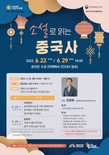 5월 24일 오전 10시부터 수원시 도서관 통합예약시스템에서 ‘독서문화프로그램→소설로 읽는 중국사’를 선택해 수강 신청할 수 있다.