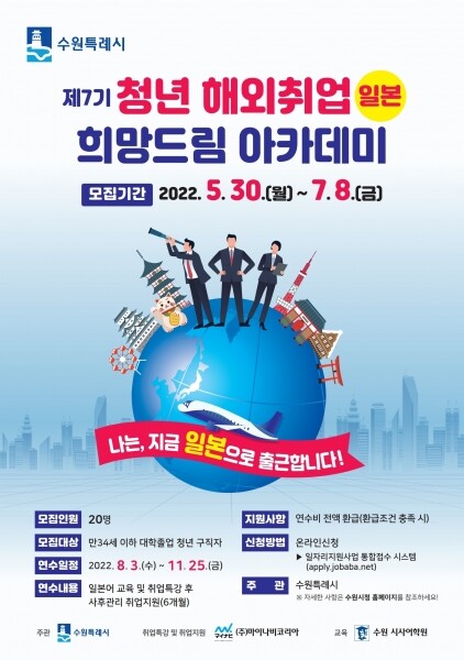 수원시가 2017년 전국에서 처음으로 시작한 ‘청년 해외취업 희망드림 아카데미’는 일본에서 취업하길 원하는 만 34세 이하 미취업 청년을 대상으로 일본어교육·취업 특강을 지원하고 일자리까지 연계해주는 프로그램이다.