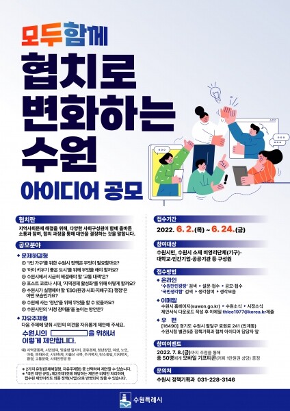 ‘모두함께 협치로 변화하는 수원’을 주제로 ‘문제해결형’, ‘자유주제형’ 등 2개 분야에서 아이디어를 공모한다.