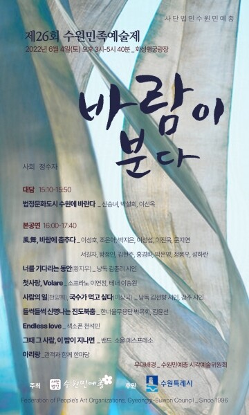 올해는 ‘바람이 분다’를 주제로 코로나19 장기화로 지친 시민들의 마음에 즐거운 바람을 일으키고 새롭고 활기찬 기운이 샘솟길 바라는 수원민예총 예술인들의 바람을 담은 다채로운 문화공연이 펼쳐진다.