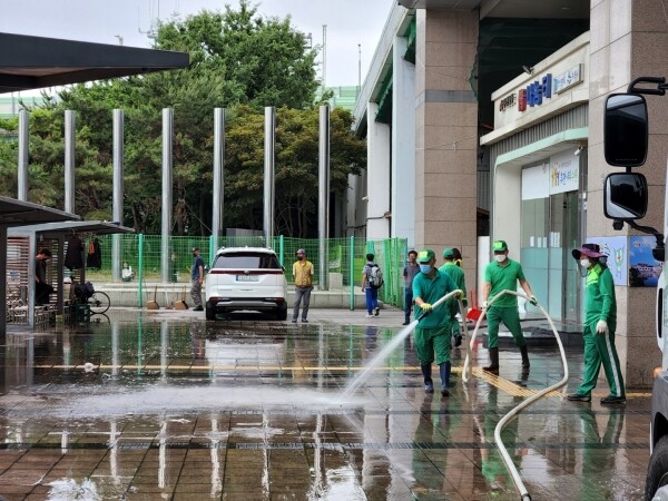 팔달구 생활안전과는 살수 차량을 활용해 수원역 광장을 청소했고 매산동 행정복지센터는 광장 일원을 청소했다.