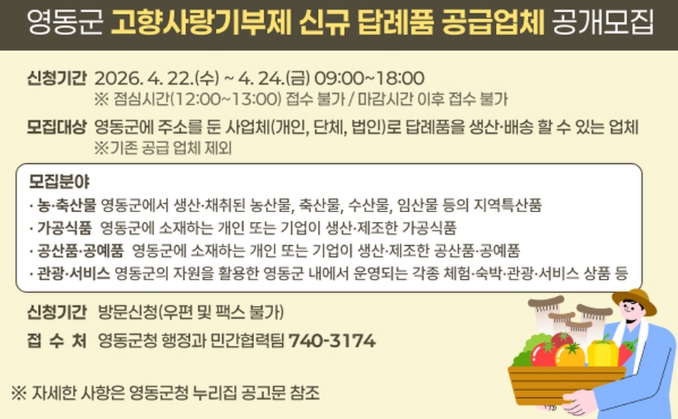[뉴스앤톡] 충북 영동군이 2026년도 고향사랑기부제 신규 답례품 공급업체를 모집한다고 8일 밝혔다.