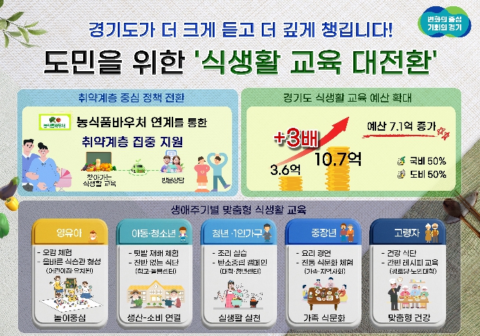 박종민 경기도 농수산생명과학국장은 “이번 사업은 교육 확대가 아니라 도민의 실제 식생활 변화를 만드는 데 초점을 둔 정책 전환”이라며 “취약계층 지원과 지역 먹거리 선순환 구조를 동시에 구축해 체감도 높은 정책으로 추진하겠다”고 밝혔다.