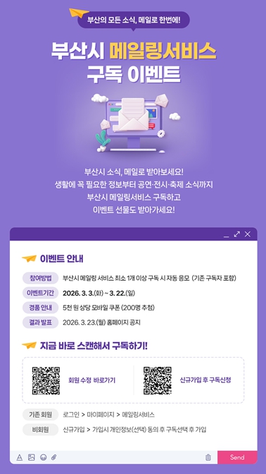 [뉴스앤톡] 부산시는 시민들이 주요 시정 소식과 생활 정보를 보다 신속하고 편리하게 받아볼 수 있도록 오는 3월 3일부터 3월 22일까지 '부산시 소식, 메일로 한 번에(메일링 서비스 구독 이벤트)'를 추진한다고 밝혔다.