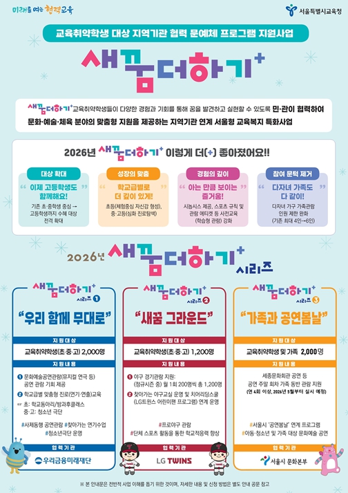 [뉴스앤톡] 서울특별시교육청은 교육취약학생에게 문화·예술·체육 및 진로탐색 기회를 제공하는 민관협력 교육복지 사업 ‘새꿈더하기’를 2026년 더욱 확대 운영한다고 밝혔다.