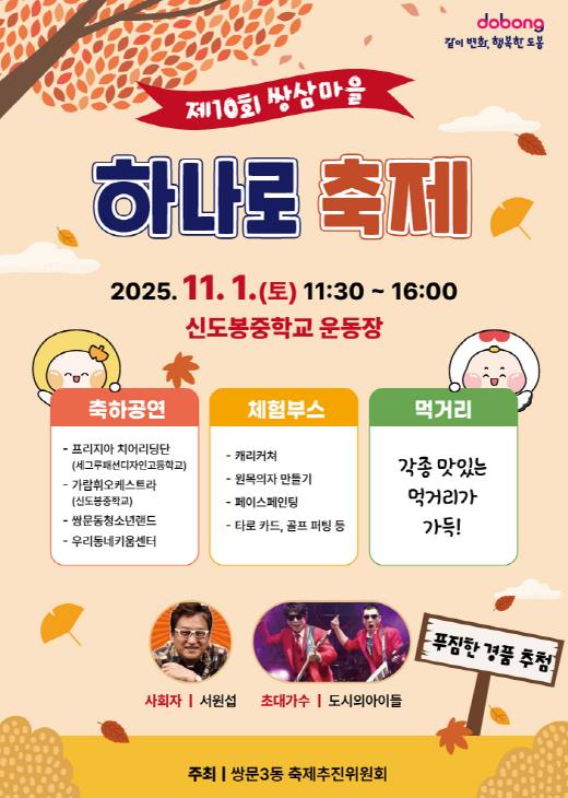 [뉴스앤톡] 서울 도봉구 쌍문3동이 오는 11월 1일 신도봉중학교 운동장에서 ‘제10회 쌍삼마을 하나로 축제’를 개최한다.
