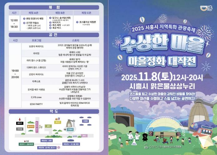 [뉴스앤톡] 시흥시는 2025년 시흥시 지역특화 관광축제 지원사업 선정 축제인 ‘수상한 마을 마을정화대작전’을 오는 11월 8일 정왕동 맑은물상상누리 일원에서 개최한다. 이번 축제는 시흥시 청년예술연합회가 주관한다.