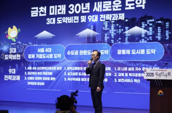 | ▲ 유성훈 금천구청장이 2025 새해인사회 행사에서 ‘금천 미래 30년’을 발표하고 있다. |