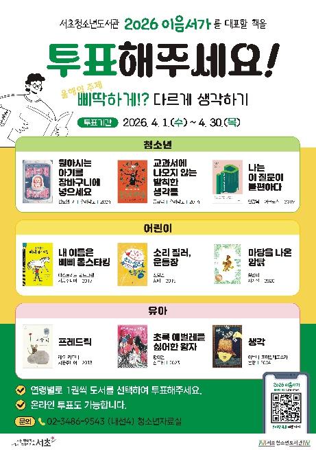 [뉴스앤톡] 서울 서초구 서초청소년도서관은 주민과 한 권의 책을 선정해 함께 읽고 생각과 경험을 나누는 ‘2026 서청도 한 책 : 이음서가’ 운영을 위해 이달 말까지 올해의 대표 도서 선정 투표를 진행한다.