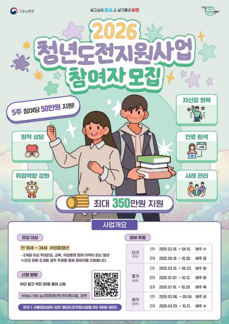 이기재 양천구청장은 “반복되는 취업 실패의 좌절과 경제적 어려움 등으로 구직을 단념한 청년들이 다시 사회와 연결되어 자신의 가능성을 펼칠 수 있도록 지원을 아끼지 않겠다”며 “청년들의 도전을 응원하는 이번 사업에 많은 관심과 참여를 바란다”고 말했다.