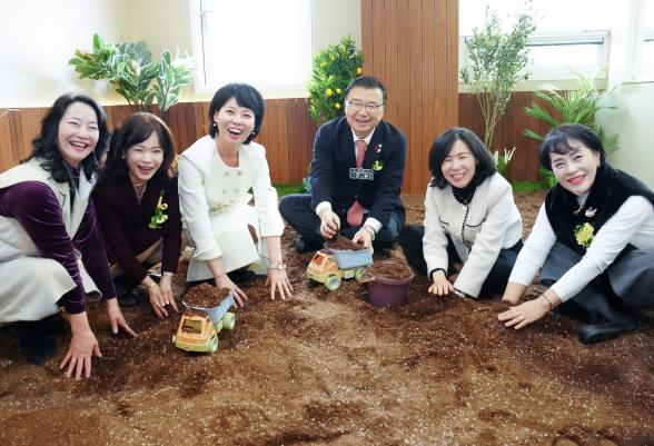 | ▲ 11일 개관한 중랑실내놀이터 5호점에서 흙‧물놀이를 체험하는 류경기 중랑구청장과 관계자들 모습 |