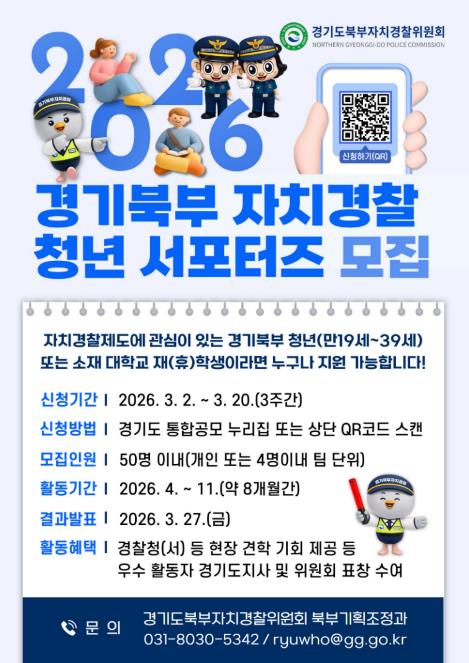 [뉴스앤톡] 경기도북부자치경찰위원회는 자치경찰제에 대한 청년층의 관심을 높이고 현장 중심 치안 활동을 함께할 ‘2026 경기북부 자치경찰 청년 서포터즈’를 3월 2일부터 20일까지 공개 모집한다.