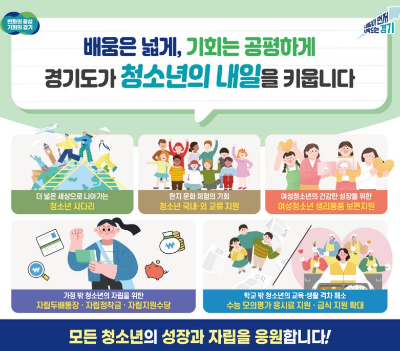[뉴스앤톡] 경기도가 청소년의 건강한 성장과 배움 기회, 생활 안정을 위해 급식, 학습·진로·자립 지원까지 아우르는 다양한 정책을 추진한다.