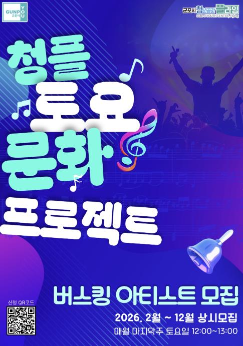 [뉴스앤톡] 군포시 청년공간 플라잉이 지역 청년 예술가들의 재능 발굴과 문화 네트워크 활성화를 위해 ‘토요 문화 프로젝트’에 참여할 청년 아티스트를 모집한다고 밝혔다. 이번 프로젝트는 청년 예술가들에게는 실질적인 공연 기회를 제공하고 시민들에게는 일상 속 문화 향유의 기회를 확대하기 위해 기획됐다.