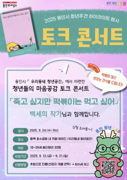 [뉴스앤톡] 용인특례시는 오는 24일 ‘죽고 싶지만 떡볶이는 먹고 싶어’의 저자 백세희 작가를 초청해 토크 콘서트를 개최한다고 16일 밝혔다.