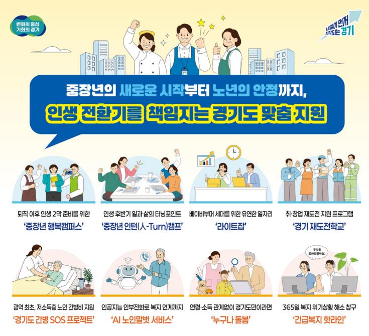 [뉴스앤톡] 퇴직 이후의 삶을 어떻게 꾸려야 할지 고민하는 중장년부터, 간병과 돌봄 문제로 어려움을 겪는 어르신과 가족까지. 경기도는 올해도 도민이 인생의 전환기에서 새로운 기회를 얻고 안정적으로 생활할 수 있도록 맞춤형 정책을 계속해 나간다.