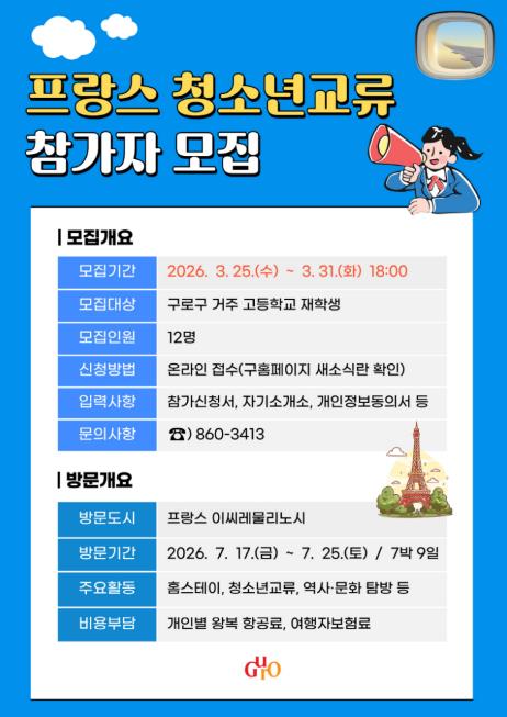 선발된 청소년은 7월 17일부터 25일까지 7박 9일 동안 구로구 자매도시인 프랑스 이씨레물리노시를 방문해 현지 가정 체험(홈스테이), 역사·문화를 체험하고 청소년 친교 활동 등을 펼칠 예정이다.