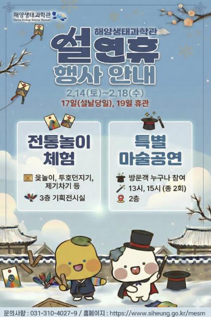 [뉴스앤톡] 시흥시는 설 명절을 맞아 시민과 방문객이 뜻깊은 시간을 보낼 수 있도록 오는 2월 14일부터 18일까지 해양생태과학관에서 설 연휴 특별 행사를 운영한다.