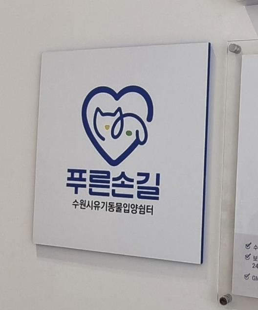 | ▲ 수원시 한 동물병원에 설치된 ‘푸른손길 수원시 유기동물 입양쉼터’ 현판 |